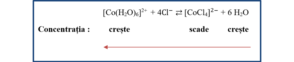 La adăugarea de apă soluției, creștem concentrația apei astfel încât se va produce și creșterea concentrației cationilor de cobalt hexahidratați, de culoare roșu-vișiniu. Echilibrul se va deplasa spre stânga, în sensul consumării componentului respectiv (H2O).