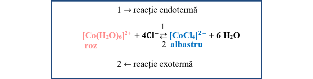 La creșterea temperaturii este favorizată reacția endotermă (reacția care are loc cu absorbție de căldură), echilibrul fiind deplasat spre dreapta cu creșterea concentrației ionului complex de tetraclorocobaltat, de culoare albastră.